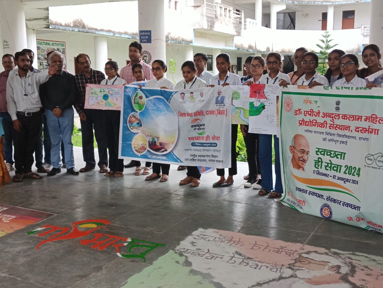दरभंगा /डॉ ० एपीजे अब्दुल कलाम महिला प्रौद्योगिकी संस्थान, दरभंगा में राष्ट्रीय सेवा योजना इकाई, राष्ट्रीय स्वच्छ गंगा मिशन, जल शक्ति मंत्रालय, भारत सरकार एवं बिहार राज्य गंगा नदी संरक्षण कार्यक्रम प्रबंधन सोसाइटी, पटना के संयुक्त तत्वावधान में समाहरणालय, दरभंगा (जिला गंगा समिति) के निर्देशानुसार “स्वच्छता ही सेवा” अभियान के अंतर्गत संस्थान की राष्ट्रीय सेवा योजना इकाई के द्वारा नदियों की स्वच्छता एवं संरक्षण पर रंगोली एवं चित्रकला प्रतियोगिता आदि का आयोजन किया गया, जिसमें संस्थान की छात्राओं ने बढ़-चढ़कर हिस्सा लिया।