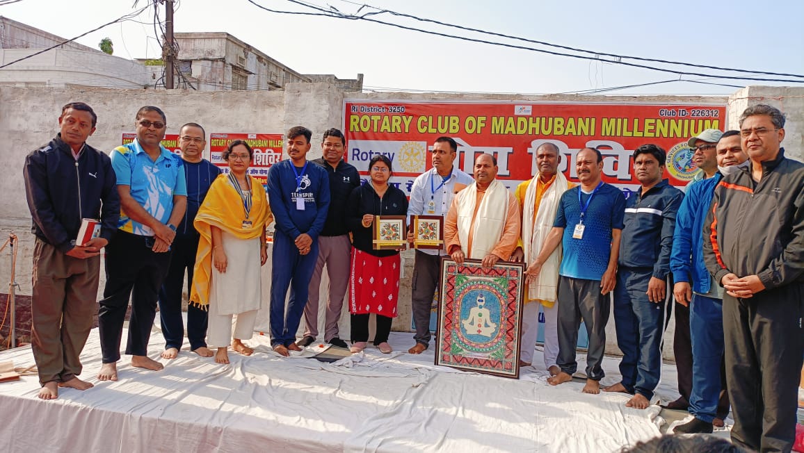 मधुबनी /मार्च को रोटरी क्लब ऑफ मधुबनी मिलेनियम की ओर से तीन दिवसीय योग शिविर का आयोजन किया जा रहा था। योग शिविर को लेकर अध्यक्ष डॉ० माला कुमारी ने बताया कि बाबू साहेब चौक स्थित क्रिएटिव पब्लिक स्कूल के परिसर में यह योग शिविर आयोजित की गयी है। विश्वविख्यात बिहार स्कूल ऑफ़ योगा, मुंगेर के प्रशिक्षक हैं। प्रशिक्षण शिविर प्रातः और संध्या काल की दो परियों में तीन दिनों तक छःह सत्र में प्रशिक्षण दिया गया। इसको लेकर गुरुवार को ही सभी तैयारी पूरी कर ली गयी थी। इस योग शिविर में पुरुष एवं महिला शिक्षाविद, चिकित्सक, राजनेता, समाजसेवी, मीडियाकर्मियों एवं आम लोग शामिल हुए। रोटरी क्लब ऑफ मधुबनी मिलेनियम के सचिव एवं रोटेरियन डॉ० के० के० दास और कोषाध्यक्ष रोटेरियन विवेक महासेठ ने बताया कि योग की प्रमुख क्रियाओं में सर्वासन, नौकासन, क्रीड़ासन, जेस्टिक आसान, भुजंगासन, मरजी आसान, वज्रासन, पद्मासन, संघ प्रछालन, योगमुद्रासन, पादहस्तासन, मर्कटासन, तिर्यक ताड़ासन, मंडूकासन, उष्ट्रासन, भुजंगासन, ताड़ासन, सूर्य नमस्कार, प्राणायम आदि मुख्य रूप से कराए और बताए गए। साथ ही दैनिक जीवन में योग किस समय और किस प्रकार करना चाहिए, योग और व्यायाम (जिम) में अंतर भी बताया गया। साथ ही योग किस प्रकार शारीरिक और मानसिक स्वास्थ्य के लिए लाभदायक है, इसकी जानकारी दी गई।