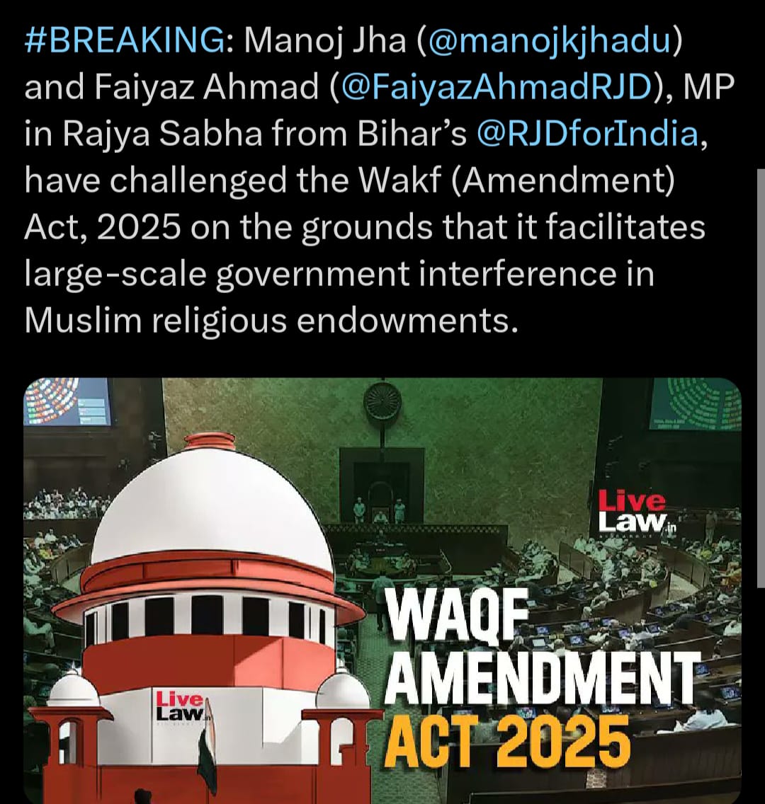 राजद की ओर से वक्फ संशोधन विधेयक के खिलाफ प्रो0 मनोज कुमार झा, मो0 फैयाज अहमद एवं मो0 नेहालुद्दीन ने सर्वोच्च न्यायालय में याचिका दायर कर न्याय की गुहार लगायी है: राजद