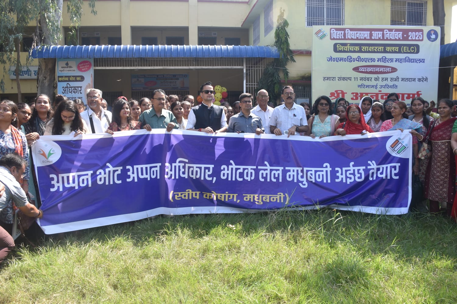 मधुबनी/ आगामी बिहार विधान सभा आम निर्वाचन 2025 के सफल, शांतिपूर्ण एवं शत-प्रतिशत मतदान के लक्ष्य को लेकर आज महिला कॉलेज मधुबनी में स्वीप कोषांग मधुबनी एवं निर्वाचक साक्षरता क्लब के संयुक्त तत्वावधान में भव्य मतदाता जागरूकता कार्यक्रम का आयोजन किया गया।