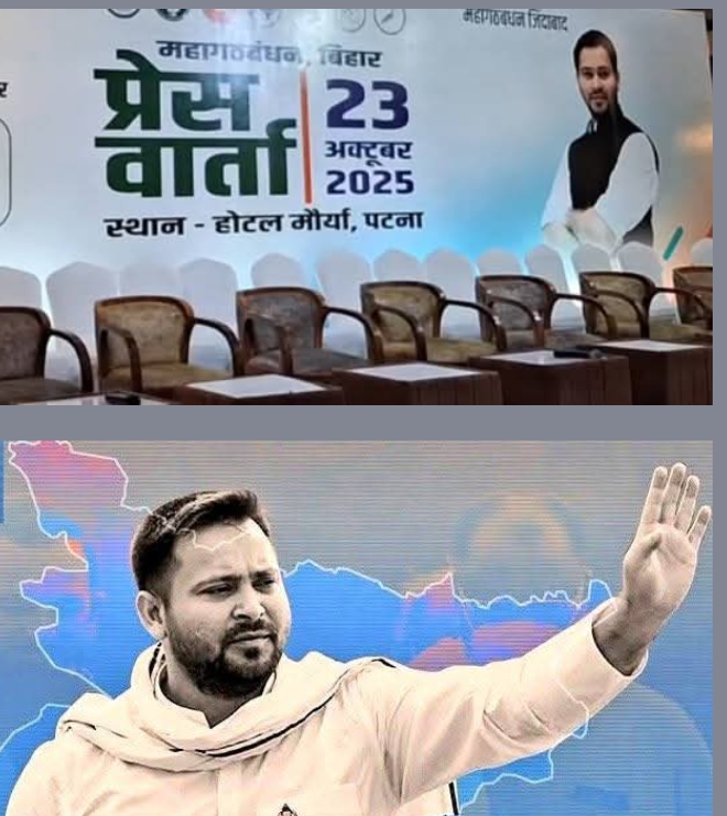 पटना,/बिहार चुनाव 2025 से पहले महागठबंधन में बड़ी राजनीतिक हलचल शुरू हो गई है। पटना के होटल मौर्या में आज राजद और कांग्रेस की संयुक्त प्रेस कॉन्फ्रेंस होनी है, जिसमें तेजस्वी यादव को महागठबंधन का मुख्यमंत्री चेहरा घोषित किए जाने की संभावना है। होटल परिसर में लगाए गए पोस्टर और बैनरों में तेजस्वी की तस्वीर प्रमुख रूप से दिख रही है, जिससे राजनीतिक संदेश लगभग साफ हो गया है।