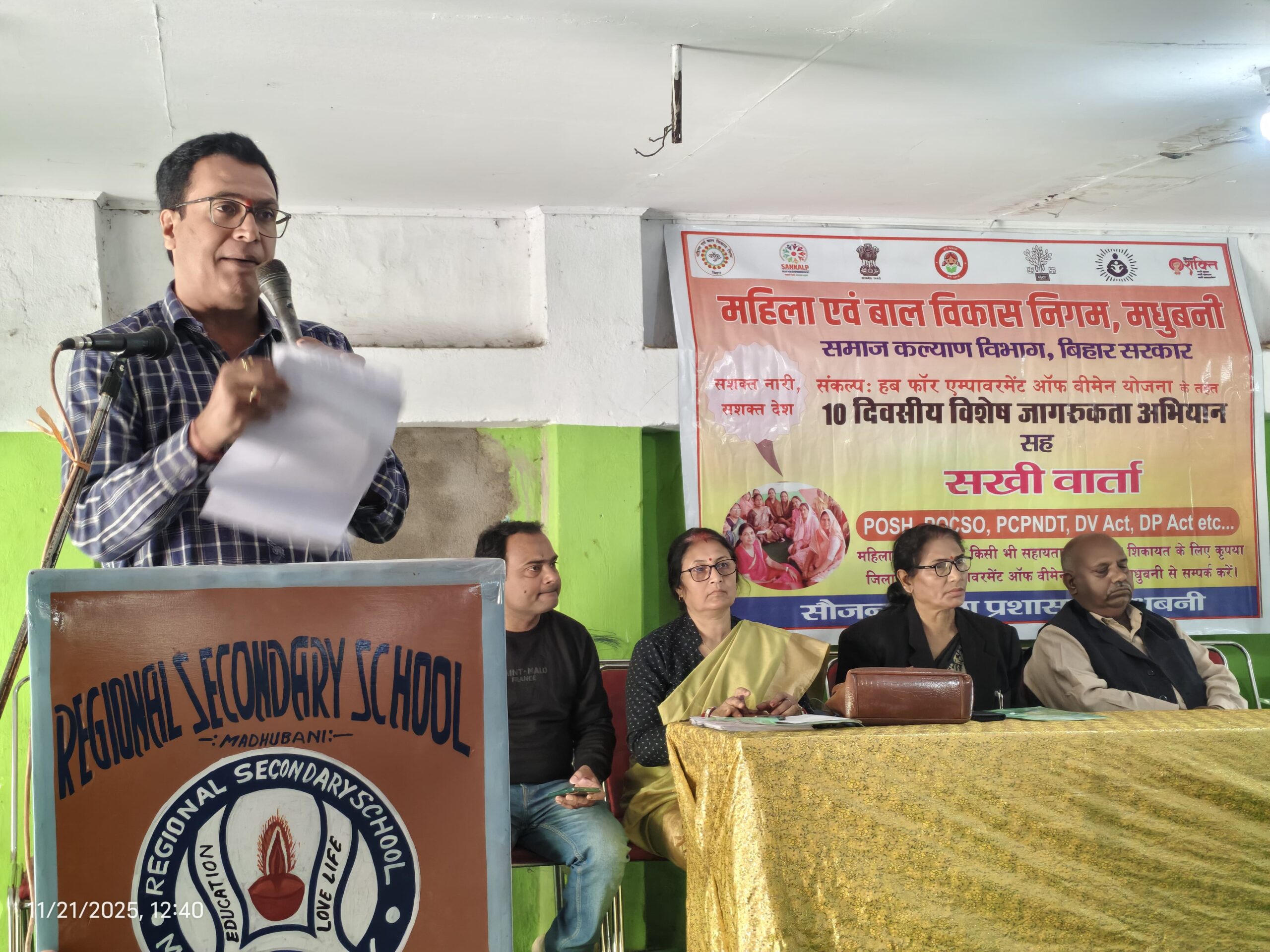 मधुबनी/महिलाओं एवं बच्चियों की सुरक्षा, उनके अधिकारों एवं संरक्षण से जुड़ी विभिन्न कानूनी प्रावधानों, सरकारी योजनाओं तथा हेल्पलाइन सेवाओं की जानकारी आम जन तक पहुँचाने के उद्देश्य से आज बाल विकास निगम, बिहार द्वारा रीजनल सेकेंडरी स्कूल में एक दिवसीय जागरूकता कार्यक्रम का आयोजन किया गया।