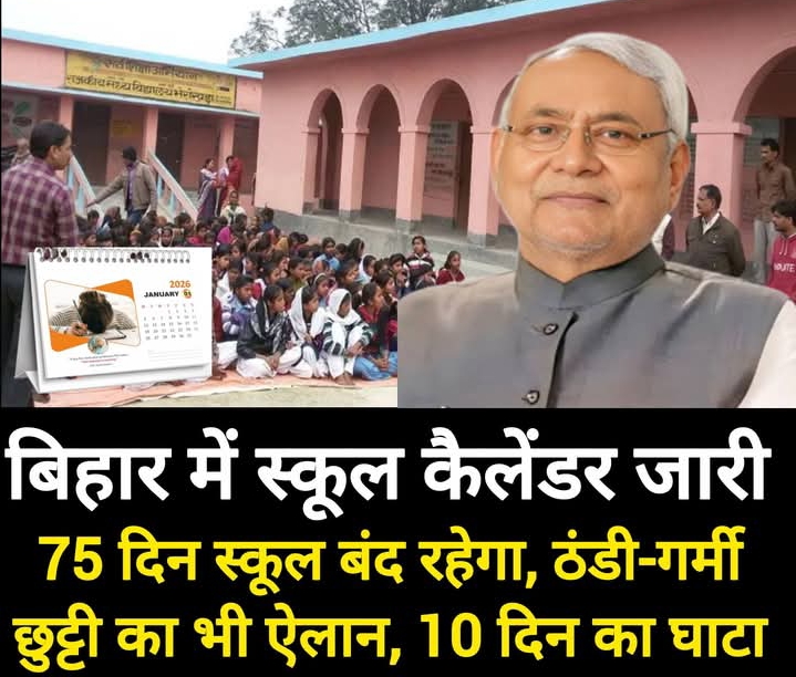 पटना /बिहार सरकार ने सरकारी स्कूलों में साल 2026 में दी जाने वाली छुट्टी को लेकर अवकाश कैलेंडर जारी कर दिया है। टोटल 75 दिनों की छुट्टी दी गई है।इसमें ठंडी छुट्टी और गर्मी छुट्टी भी शामिल है। आसान भाषा में कहा जाए तो शिक्षकों को 10 दिनों की छुट्टी का घाटा हुआ है क्योंकि रविवार होने के कारण 10 अतिरिक्त दिन नहीं दिए जाएंगे।