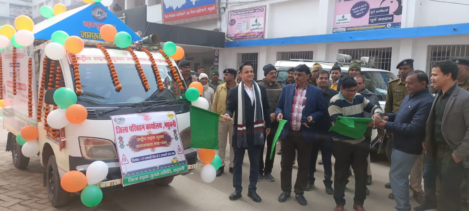 मधुबनी/सड़क सुरक्षा माह 2026 के अवसर पर आमजनों को यातायात नियमों के अनुपालन यथा सीट बेल्ट लगाने, हेलमेट पहनने एवं सड़क सुरक्षा संबंधी नियमों से जागरूक करने के लिए सड़क सुरक्षा जागरूकता रथ को जिलाधिकारी, आनंद शर्मा ने हरी झंडी दिखाकर रवाना किया। यह रथ पूरे मधुबनी जिले में आमजनों को सड़क सुरक्षा नियमों से जागरूक कराएगा। साथ ही सड़क पर सदैव यातायात नियमों के पालन के लिए जिला परिवहन कार्यालय मधुबनी में कार्यरत सभी पदाधिकारी एवं कर्मियों के द्वारा सड़क सुरक्षा के नियमों का पालन करने हेतु आम जनों को भी सड़क सुरक्षा के प्रति जागरूक किया जा रहा है।