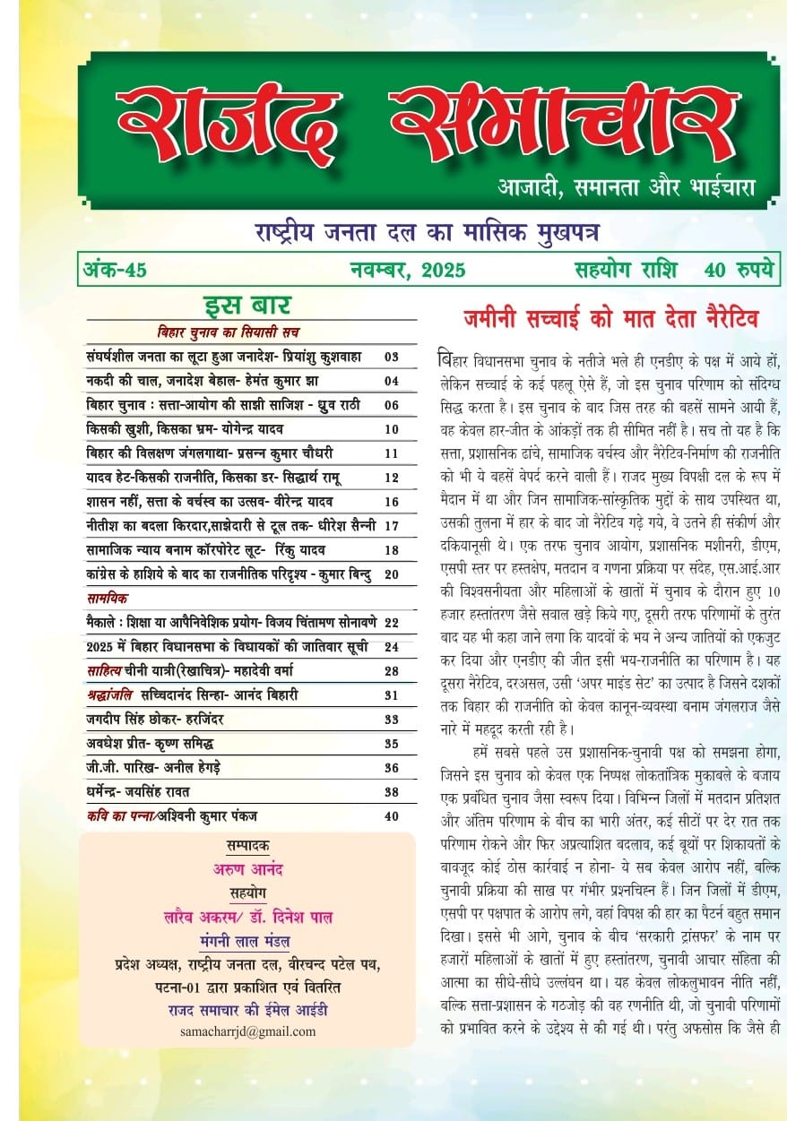 बहुत कम लोगों को यह जानकारी होगी कि ‘राजजद समाचार’ पिछले तीन-चार वर्षों से नियमित मासिक पत्रिका के रूप में प्रकाशित हो रही है। संभवतः भारत की किसी भी राजनीतिक पार्टी का मुखपत्र इतनी स्पष्ट वैचारिक विविधता, समृद्ध सामग्री और गहन विश्लेषण के साथ लगातार प्रकाशित नहीं होता। इस पत्रिका का ताज़ा 44वाँ अंक अर्थात् नवम्बर 2025 अंक विशेष रूप से बिहार विधानसभा चुनाव परिणामों पर केंद्रित है। इस अंक में ‘बिहार चुनाव का सियासी सच’ शीर्षक के अंतर्गत दस महत्वपूर्ण आलेख शामिल हैं, जो न केवल चुनाव परिणामों का विश्लेषण करते हैं, बल्कि सत्ता-संरचना, जातीय समीकरण, चुनाव आयोग की भूमिका और मीडिया नैरेटिव – सब पर गंभीर विमर्श प्रस्तुत करते हैं।