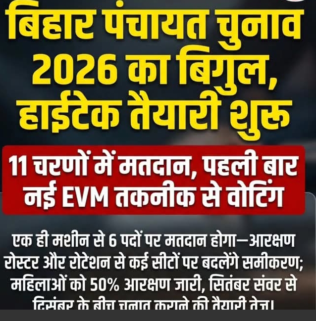 बिहार पंचायत चुनाव 2026 को लेकर तैयारियां तेज हो गई हैं। इस बार राज्य में 11 चरणों में मतदान कराया जाएगा। पहली बार मल्टी पोस्ट ईवीएम का इस्तेमाल होगा, जिससे एक ही मशीन से 6 पदों के लिए वोटिंग की जा सकेगी। चुनाव प्रक्रिया को हाई-टेक बनाने की तैयारी है।